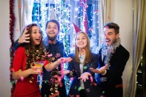 Un gruppo di amici che festeggia il capodanno tutti insieme in una casa presa in affitto per l’occasione