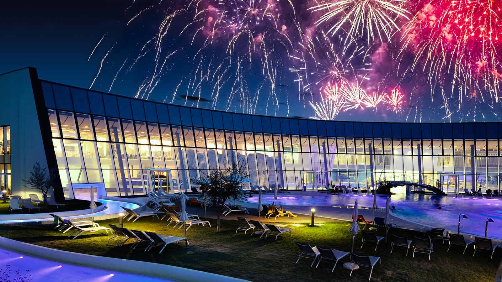 Sarà possibile muoversi liberamente tra le piscine interne e tra quelle esterne con un’offerta di situazioni musicali varia e costante. E ovviamente alla mezzanotte non potrà mancare lo spettacolo pirotecnico che risplenderà sulla superficie dell’acqua. Brindi con prosecco e pandoro per tutti gli ospiti.