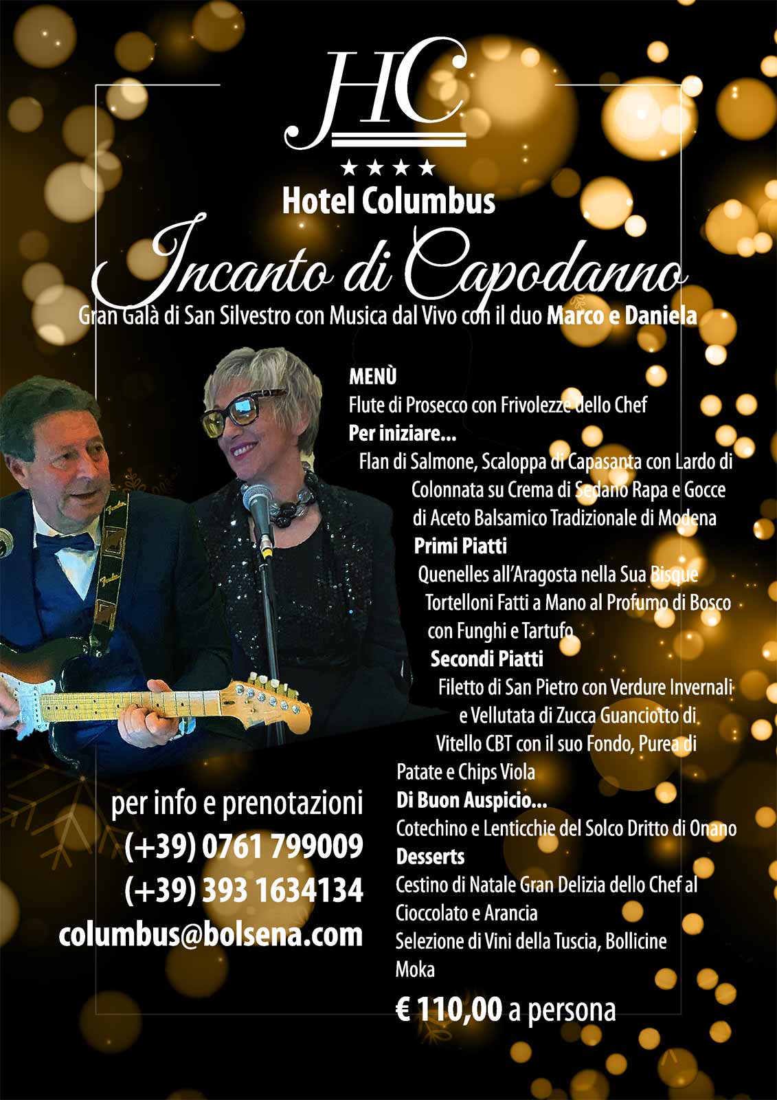 Per il Veglione di Capodanno l’Hotel Columbus ha pensato per i suoi ospiti una serata all’insegna del gusto e della musica dal vivo. Lo Chef e il suo Staff proporranno una cucina del territorio condita da una nota di creatività, e presenteranno con meticolosa cura piatti che vantano le migliori materie prime e prodotti tipici stagionali che rispettano la tradizione.