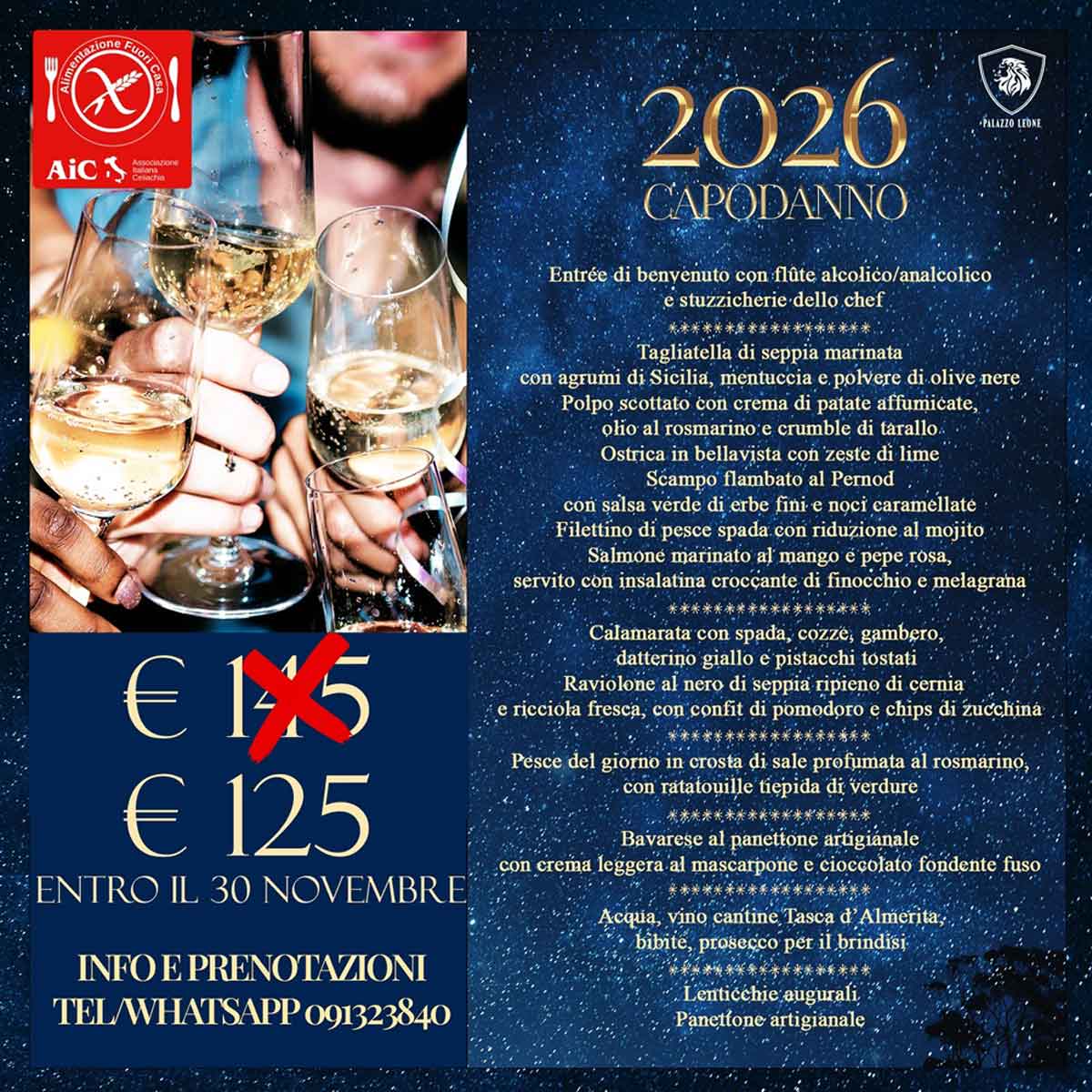 Il cenone organizzato a Palazzo Leone è inserito in un contesto raffinato ed esclusivo. Il menù prevede portate a base di pesce dove ogni piatto viene curato per stuzzicare i sensi, soprattutto la vista e il gusto: si comincia con un welcome drink e con ben 6 antipasti per proseguire con due primi e un secondo, oltre ad un dolce e vino compreso il brindisi.