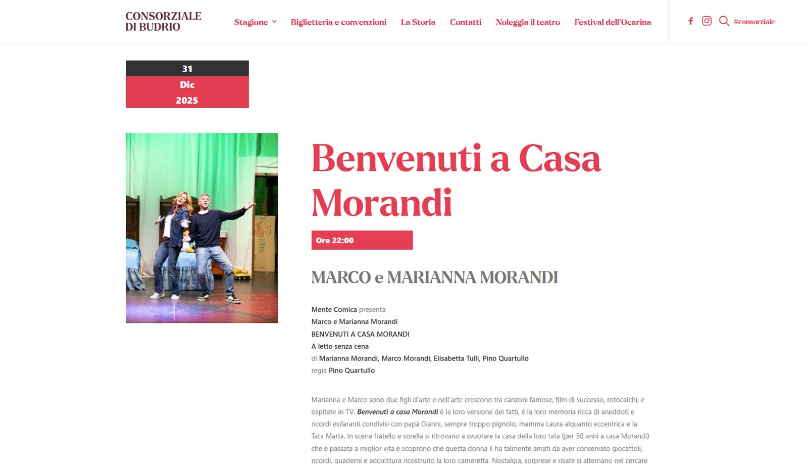 Sul palcoscenico del Teatro Consorziale di Budrio andrà in scena lo spettacolo di Benvenuti in Casa Morandi, con Marco e Marianna Morandi.